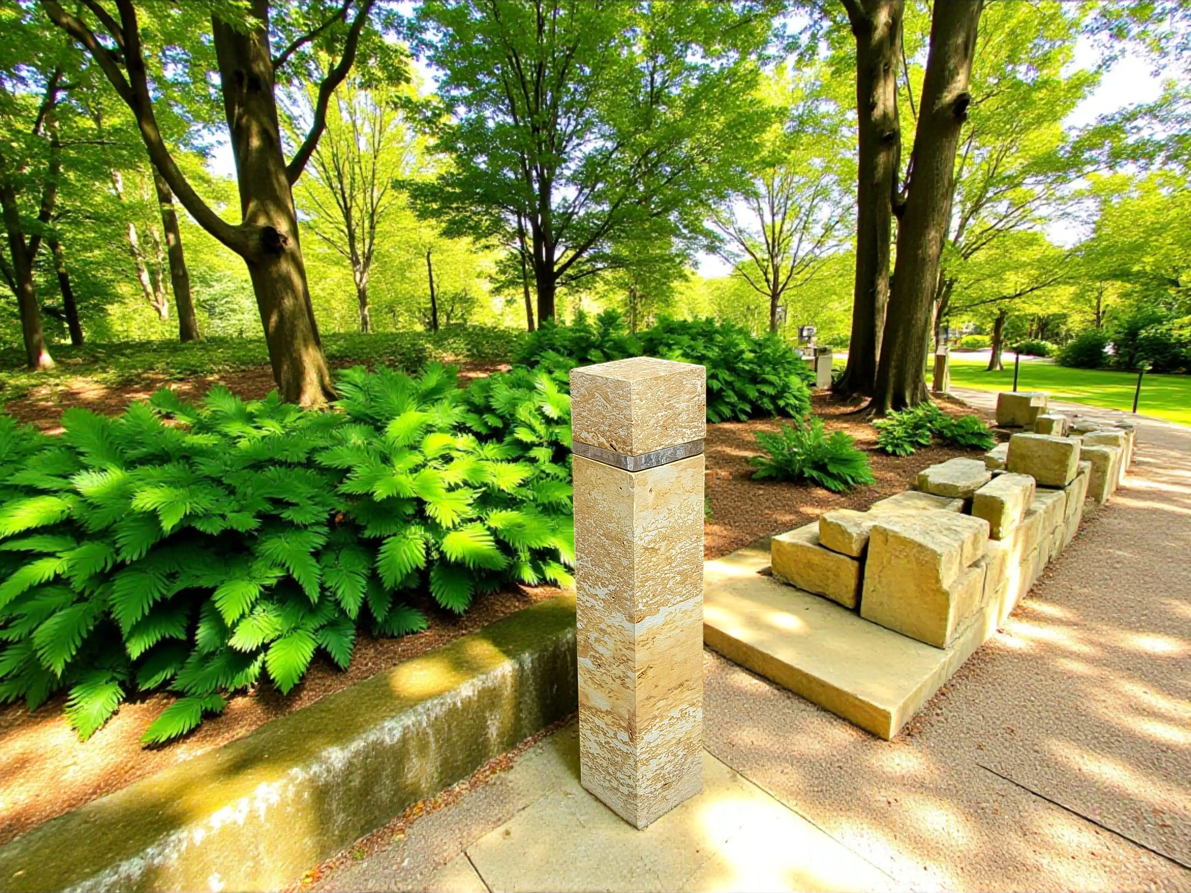 Osvětlovací segment vychází z tvaru základního kamenného sloupku. Pro výrobu jsme použili polotovar z barnatého skla vyrobeného v české rodinné sklárně. Sklo tohoto složení vyniká jiskrnou prostupností světelných paprsků připomínající optické vlastnosti horského křišťálu a zároveň je odolné povětrnostním vlivům. Dlouhodobě si zachovává čistý křišťálový vzhled. Skleněný čtverec s otvorem pro světelný zdroj je vyráběn speciální technologií „tavení do formy“. Sklovina ve formě je postupně zahřívána až k úplnému roztavení, přijme tvar i strukturu dle formy. Následně je řízeně pozvolna ochlazována, aby byl výrobek mechanicky odolnější a stabilnější.