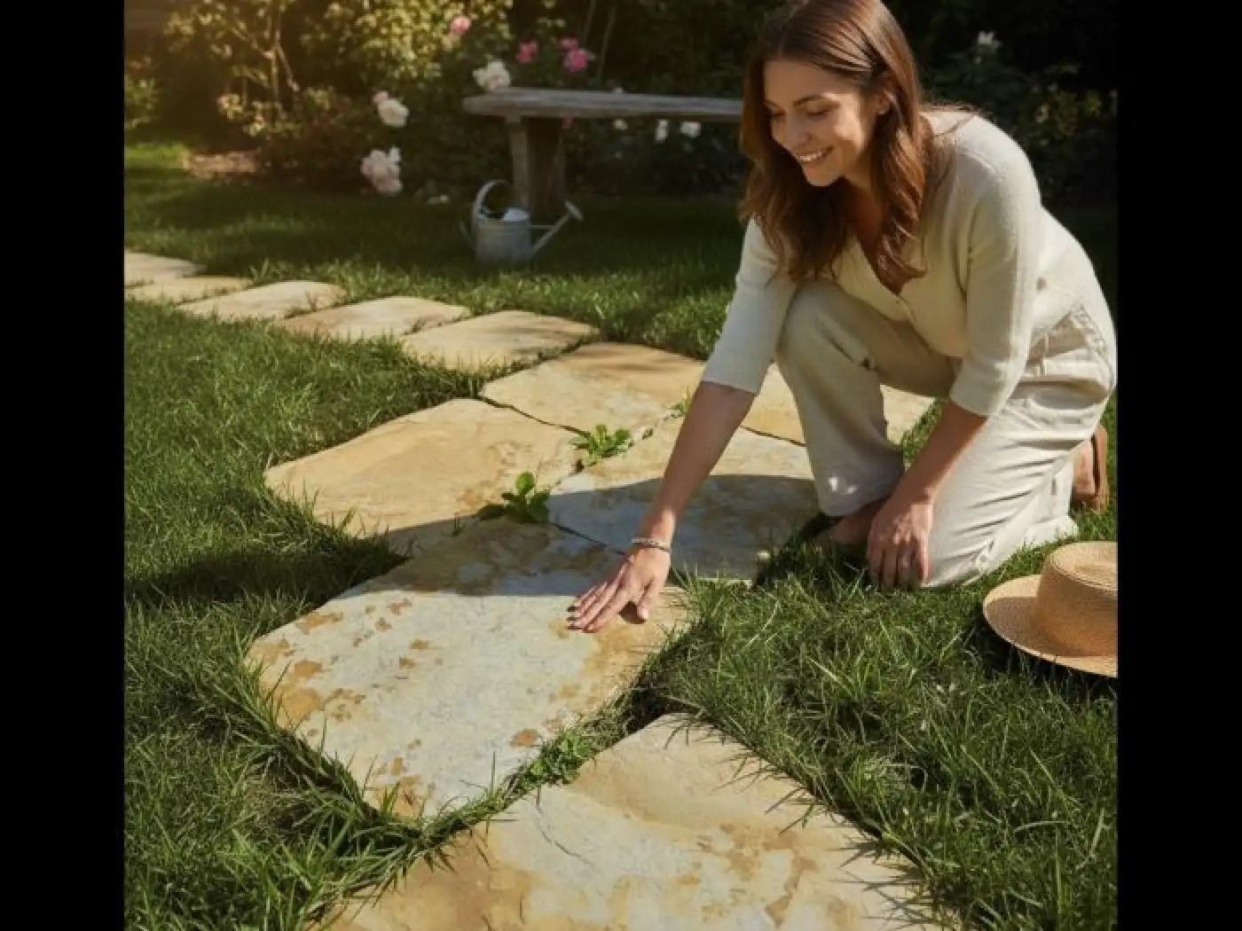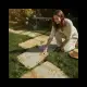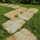 1. Kamenné nášlapy pokládáme tak, že zakoupený kus položíme na trávu a vyřežeme kolem něj do trávy obrys.