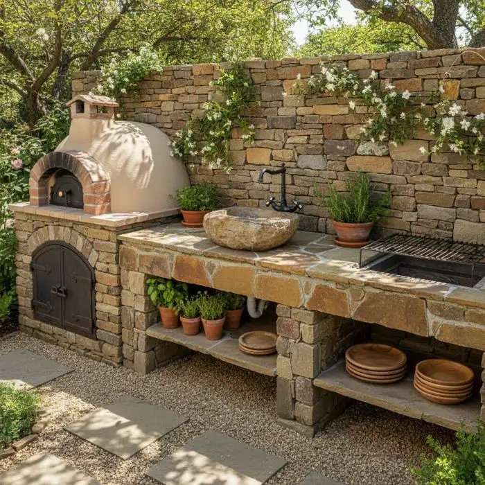 Zahradní umyvadlo je vyrobeno z přírodního kamene, konkrétně z pískovce žluté barvy. Umyvadlo může sloužit v zahradní kuchyni nebo jako dekorace.