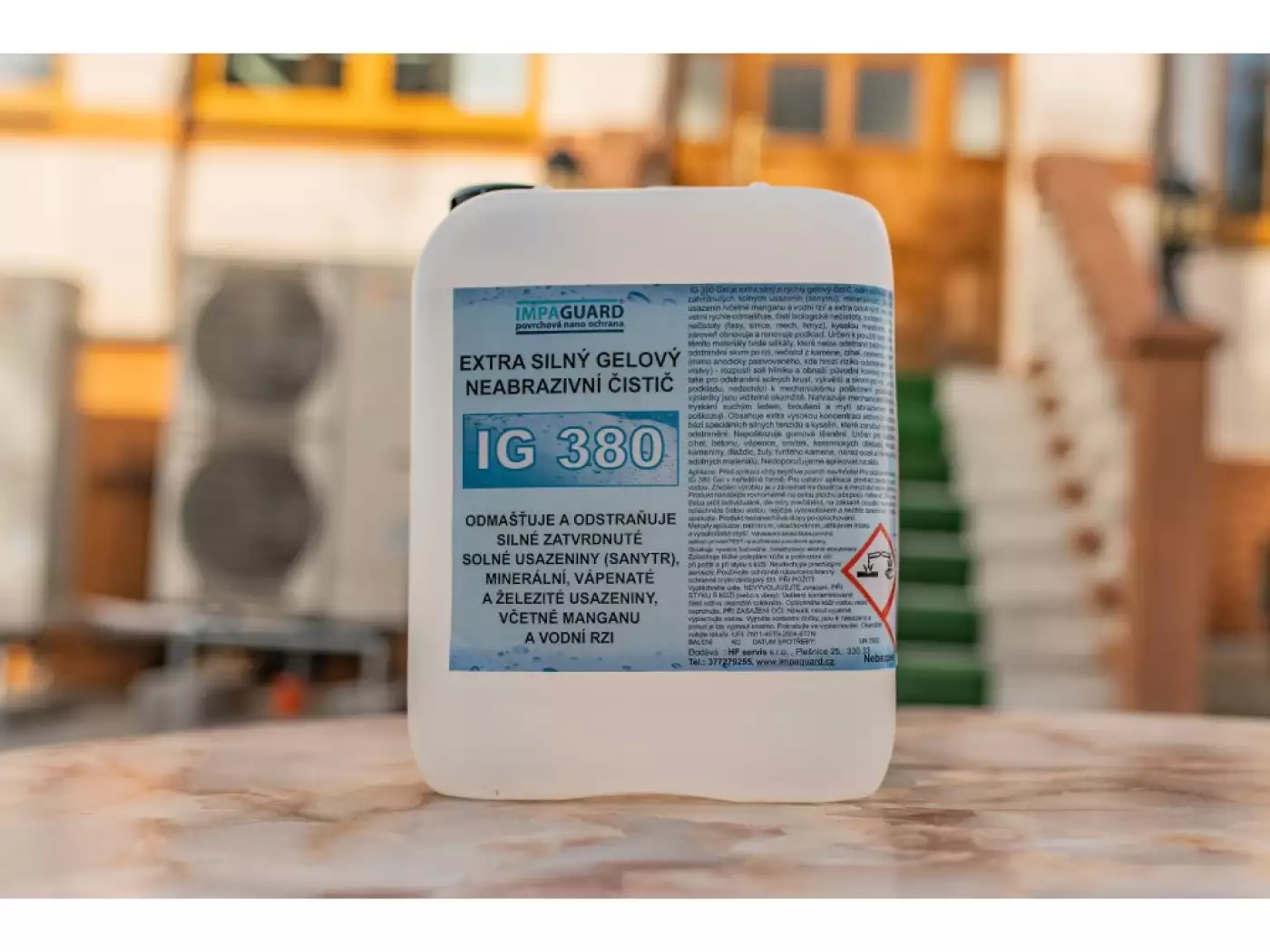 IG 380 Gel je určen pro odstraňování vodního kamene, vápenatých a minerálních usazenin, rzi a solných usazenin (sanytru) z minerálních povrchů. Odmašťuje, odstraňuje nečistoty a povlaky z vody (minerální, vápenaté, železité usazeniny, řasy, sinice, vodní šlem).